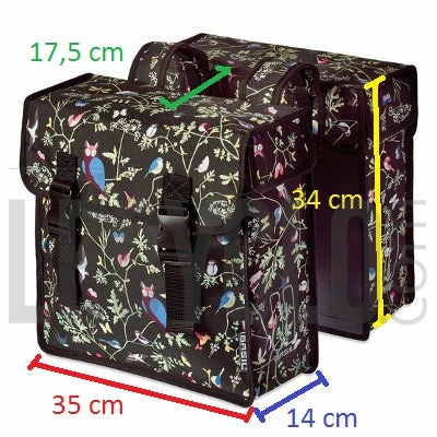 Avec une fermeture à rabat et des clips servant à sécuriser le contenu, cette double sacoche possède des fonds rigides et est faite en polyesther déperlant pour une meilleure protection en cas d’humidité. Elle possède un look élégant assez féminin grâce à des motifs printaniers à fleurs, hiboux, papillons et autres oiseaux.