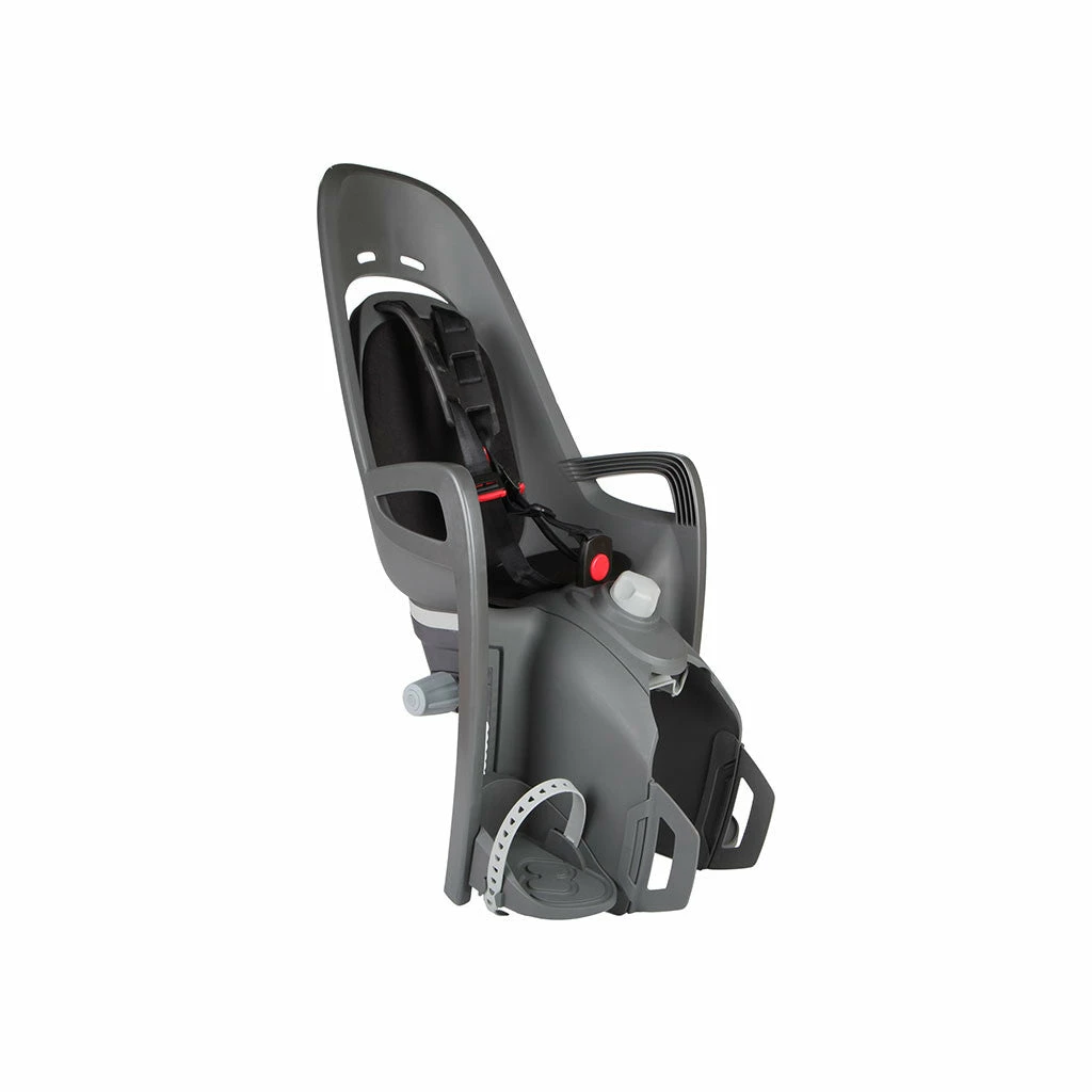 Procédez ensuite à l’installation. La fixation se fait via l’adaptateur à crochets, à placer sur le porte-bagages, il suffit de tourner la molette pour resserrer sur les tubes du porte-bagages. Ce dispositif permet aussi le montage du siège Hamax sur vélo électrique avec batterie sous le porte-bagages. Attachez enfin la sangle additionnelle de sécurité à la tige de selle.